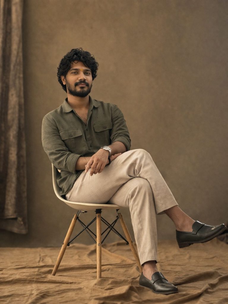 Portrait of a fashionable man in black pants and white shirt, sitting on a stool with an introspective expression.